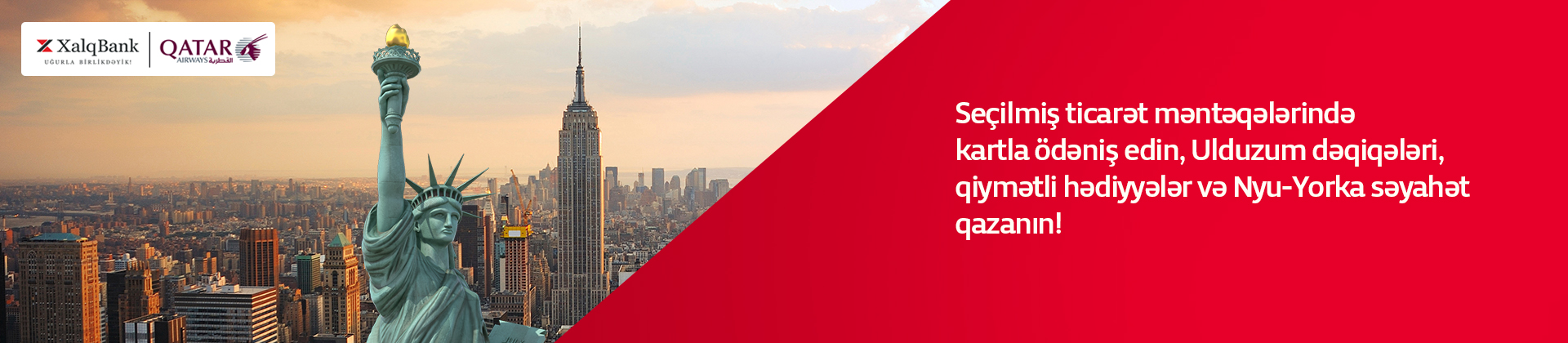 «Nyu-Yorka səyahət» kampaniyası çərçivəsində 01.05.2017-31.12.2017 tarixlərdə Xalq Bank saytının “Partnyor Ticarət Məntəqələri bölməsində http://www.xalqbank.az/az/aksiya/partners/ göstərilən şərtlərlə əməliyyat aparan müştərilərə 40 dəqiqəyədək Bakcell danışıq dəqiqələri hədiyyə olunacaq.